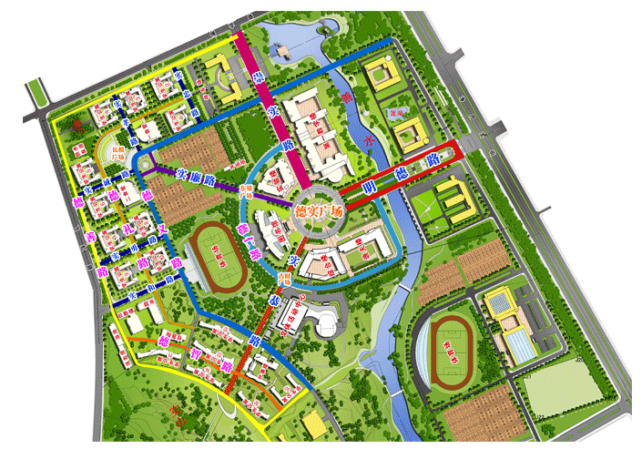 学校街路名字来源于学校"德、实、学、善"的学校文化内核和”明德崇实“的校训精神,将学校东门主路命名为”明德路“,将北门主路命名为“崇实路”,将学校南门主路命名为”尚学路“;学校环行路,以”德“字开头,分别与”仁、义、礼、智、善、真、俭、谦“进行有序组合,分别命名为德仁路、德义路、德礼路、德智路、德善路、德真路、德俭路和德谦路;学校直行路,以”实“字开头,分别与“忠、孝、诚、勇、和、廉、恭、勤”进行有序组合,分别命名为实忠路、实孝路、实诚路、实勇路、实和路、实廉路、实恭路和实勤路。以上路名详细设置以路牌为准。