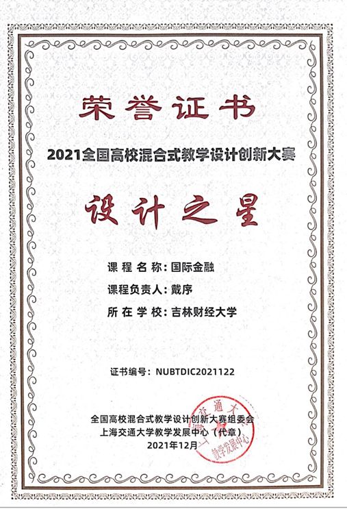 2021金融学院戴序老师获得第三届全国高校混合式教学设计创新大赛“设计之星”奖
