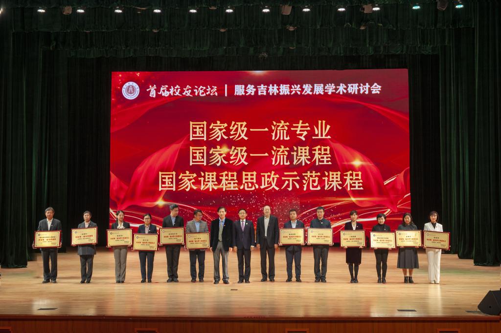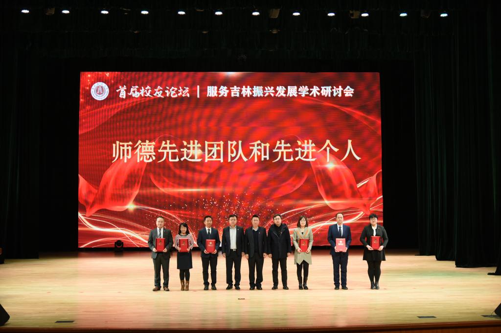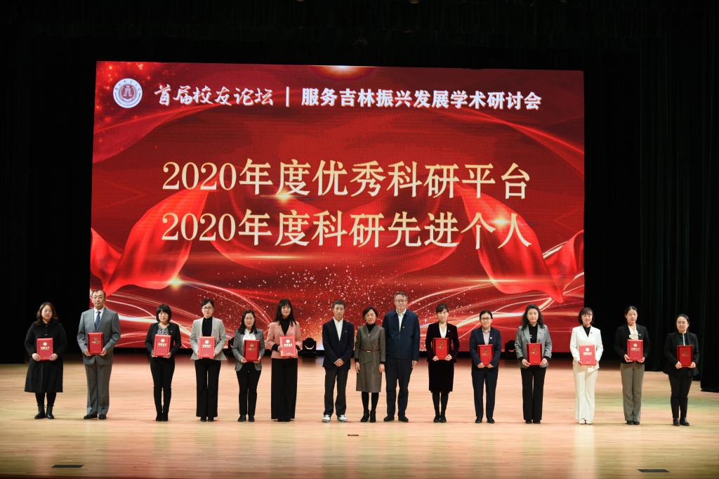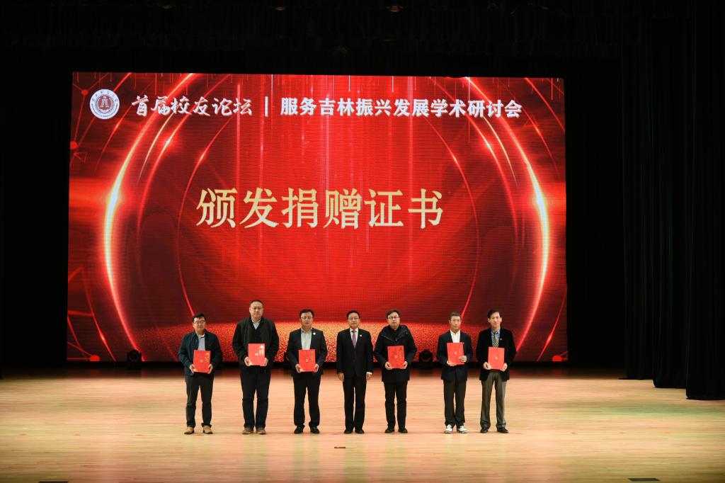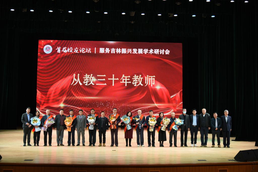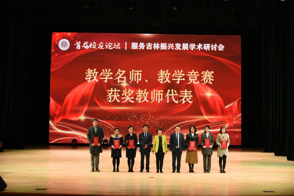 校党委书记孙杰光和雷友校友、崔少华校友为“国家一流专业、国家一流课程和国家课程思政示范课程”代表颁奖;校党委副书记赵惠敏和于志良校友、张云鹤校友为“吉林省教学名师、教学竞赛获奖代表”颁奖;副校长王菁华和郑士学校友、杨体军校友为学校2020年度优秀科研平台和科研先进个人代表颁奖;副校长于金欢和刘庆校友、安洪滨校友为“践行立德树人初心使命、争做新时代‘四有’好老师”师德先进团队和先进个人代表颁奖;校友代表何俊岩、陈宁、胡天伟、王耀辉、吕洪仁、曾荣胜、巩赞华、李由、孙九龙为学校“从教三十年”教师代表献花;校党委书记孙杰光为校友代表崔少华、郑士学、刘庆、安洪滨、胡天伟、巩赞华颁发捐赠证书。