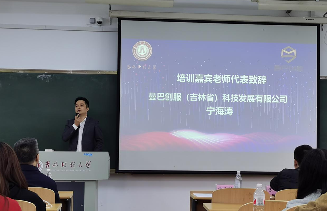曼巴创服科技发展有限公司创始人宁海涛作参训企业导师代表发言。宁老师表示,高校学生与企业对接,有助于培养职业人意识,对今后的就业具有重要意义,在今后的培训中,各位指导老师会倾囊相授,用心指导。