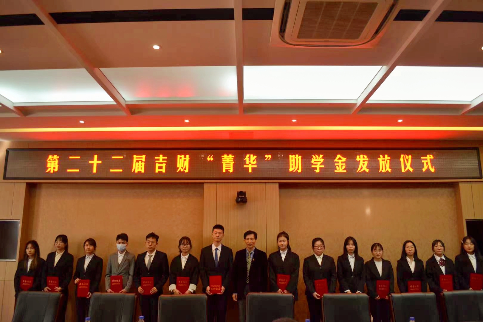 仪式上,校友工作办公室主任袁贵成宣读了第二十二届吉财“菁华”助学金获得者名单。校友崔少华为助学金获得者颁发了荣誉证书并送上亲笔签名信。