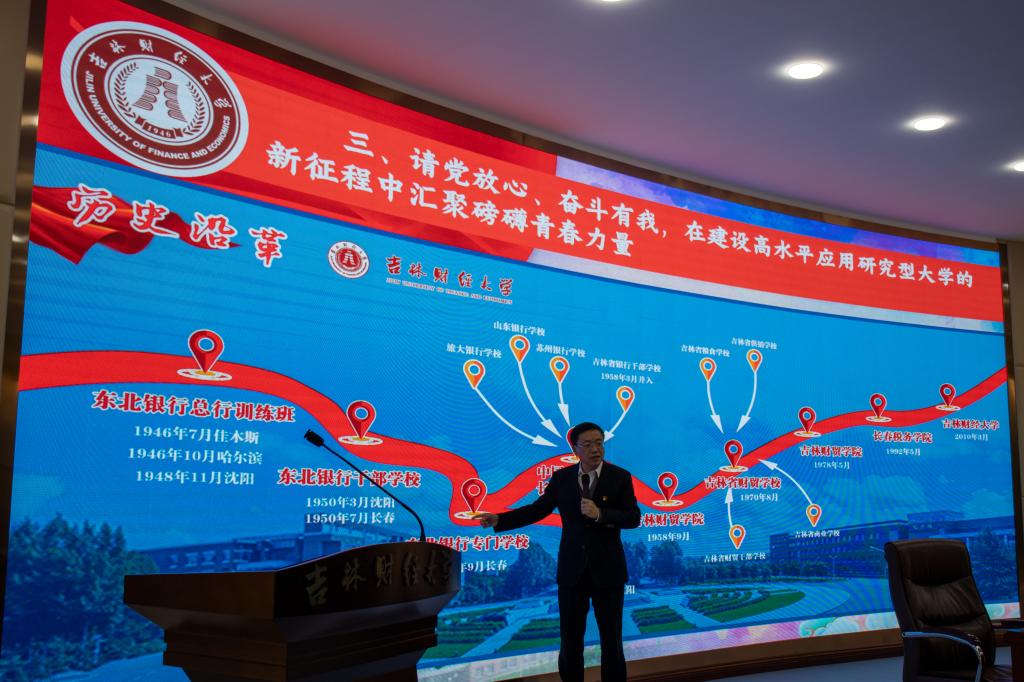 随后,校党委书记孙杰光以《认真学习贯彻党的十九届六中全会精神 弘扬伟大的建党精神 培养造就新时代财经英才》为题,从“请党放心、强国有我”、“请党放心、振兴有我”、“请党放心、奋斗有我”三个维度,以世情、国情、省情、党史党情、校史校情五个视角讲授了一堂精彩的思政课。首先,孙杰光带领全体青年师生深入学习了党的十九届六中全会精神。他说,这次全会是在我们党成立一百年的重要历史时刻,在党和人民胜利实现第一个百年奋斗目标、全面建成小康社会,正在向着全面建成社会主义现代化强国的第二个百年奋斗目标迈进的重大历史关头召开的。全会通过的《中共中央关于党的百年奋斗重大成就和历史经验的决议》是一篇马克思主义的纲领性文献,必将对推动全党统一思想、统一意志、统一行动,团结带领全国各族人民以史为鉴、开创未来,埋头苦干、勇毅前行,在新时代更好坚持和发展中国特色社会主义、实现中华民族伟大复兴产生重大而深远的影响。《中共中央关于党的百年奋斗重大成就和历史经验的决议》时间跨度长,涉及范围广,阐述了党的新民主主义革命时期、社会主义革命和建设时期、改革开放和社会主义现代化建设时期和新时代中国特色社会主义时期所取得的伟大成就,发生的历史性变革,全面总结了我们党百年奋斗五个方面的历史意义和10个方面的历史经验,特别是总结了其中的原创性思想、变革性实践、突破性进展和标志性成果,对成就梳理全面,对经验分析透彻,充分展示了马克思主义的强大生命力,增强了全党锚定既定目标,意气风发走向未来的勇气和力量。其次,在“请党放心、强国有我”第一个大问题中,孙杰光讲述了如何从“四个伟大成就”中,汲取砥砺前行的力量,如何从“五个庄严宣告”中,读懂中国全面小康的伟大光荣,如何从“伟大建党精神”中,体悟中国共产党人鲜明的政治品格,如何从“九个必须”中,解锁武装头脑、真抓实干的实践密码等四个方面问题,他强调指出,中国共产党建党求什么?坚持真理、坚守理想;中国共产党立党为什么?践行初心、担当使命;中国共产党兴党凭什么?不怕牺牲、英勇斗争;中国共产党强党靠什么?对党忠诚、不负人民;再次,在“请党放心、振兴有我”第二个大问题中,孙杰光从历史维度回顾了东北发展历程,强调要深刻领会习近平总书记关于东北全面振兴的殷切期望和目标定位;从战略维度分析了东北全面振兴面临的机遇挑战,指出如何准确把握习近平总书记关于东北全面振兴的重大判断;强调要从实践维度把握新发展阶段、贯彻新发展理念、构建新发展格局,推动高质量发展,确保实现习近平总书记提出的东北振兴“十四五”时期要有突破、要有战略性举措的目标。他强调指出,东北振兴面临“习近平总书记亲自擘画新时代东北全面振兴的战略性机遇”、“党中央全力支持东北振兴的政策性机遇”、“深化东北亚经济合作、扩大开放的机遇”、“新一轮科技革命带来的创新机遇”等四大机遇,具有“制造业优势,商品粮基地优势,沿边近海优势,生态环境优势,科教人文优势”等五大优势。为贯彻落实习近平总书记 “构建优势互补高质量发展的区域经济布局”“加快推进长吉一体化发展,培育发展现代化都市圈”的总体要求,吉林省委制定了“一主六双”高质量发展战略,力争要在“构建优势互补高质量发展的区域经济布局、培育长春都市圈城市群”、“构建多点支撑、多业并举、多元发展的产业发展新格局”、“新基建‘761’工程、交通强省等‘两新一重’项目投资”、“推进‘数字吉林’建设、加快对老工业基地全方位全角度全链条数字化、智能化、网络化改造提升”、“深化创新驱动发展战略、推动转型升级、新旧动能转换”、“深化改革、优化营商环境、构建现代市场经济体制、”“扩大开放合作、融入国内国际双循环新发展格局、建设开放合作高地”等七个方面取得突破;最后,在“请党放心、奋斗有我”第三个大问题中,孙杰光从党的新民主主义革命时期、社会主义革命和建设时期、改革开放和社会主义现代化建设时期和新时代中国特色社会主义时期等四个历史时期、以学校的社会发展背景、师生社会实践、人才培养成效、服务社会经济发展等四个方面详细梳理了学校红色金融的发展历史和不同发展阶段的专业设置,他强调指出,taptap点点在75年的办学历程中,逐渐形成了“艰苦奋斗的创业精神、与时俱进的创新精神、奋斗不止的实干精神、攻坚克难的拼搏精神和甘于奉献的爱心精神”,并对青年师生饱含深情地提出了四点希望:一是坚定理想信念,厚植爱国情怀;二是加强品德修养,增长知识见识;三是培养奋斗精神,学会自找苦吃;四是增强综合素质,实现全面发展。孙杰光希望青年师生要立大志、明大德、成大才、担大任,大力弘扬伟大建党精神,勿忘昨天的苦难辉煌,无愧今天的使命担当,不负明天的伟大梦想,以史为鉴、开创未来,埋头苦干、勇毅前行,为实现第二个百年奋斗目标、实现中华民族伟大复兴的中国梦而不懈奋斗。