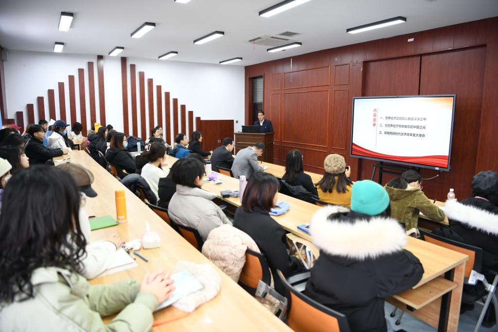 本网讯(国际经济贸易学院 供稿)为深入学习贯彻习近平新时代中国特色社会主义思想,深入学习领会党的十九届六中全会精神,积极响应吉林省委书记景俊海“创业有你、就在吉林”的号召。11月30日上午,校党委副书记岳宏以《信仰铸魂、青春筑梦,做新时代国家经济贸易的栋梁之才》为题,将十九届六中全会精神与其研究方向相结合,为国际经济贸易学院师生讲授了一场深刻生动的思政课。思政课由国际经济贸易学院党总支书记刘宇涛主持,学院领导班子、各教研室主任、教师代表、全体辅导员及全体研究生参加了会议。