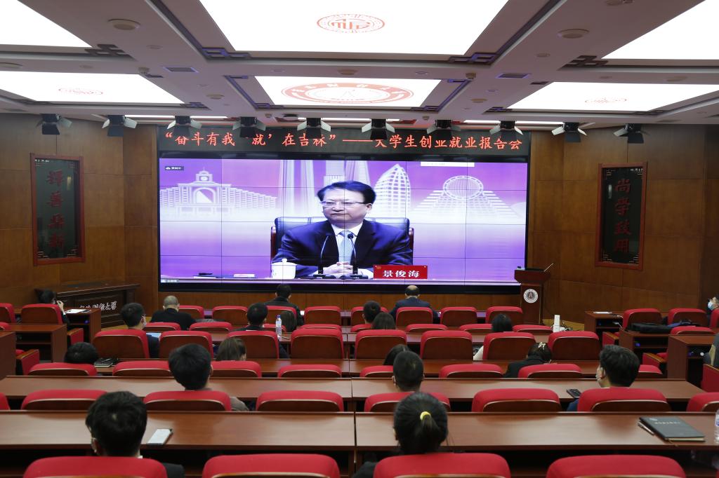 会上,省委书记景俊海以“奋斗有我,‘就’在吉林”为题,作了一场内容丰富、精彩生动的报告,不仅生动描绘了吉林振兴发展的美好前景,详细阐释了“就”在吉林的政策支持和发展优势,并再次向同学们郑重发出扎根吉林,圆梦启航,砥砺奋斗的诚挚邀请。景书记的讲话语重心长,催人奋进,充分体现了贯彻习近平总书记关于人才工作和毕业生就业工作重要指示精神的高度政治自觉,对广大高校毕业生留省就业创业的高度重视和求才若渴、广聚英才的拳拳之心,也充分体现了对莘莘学子砥砺奋进、报效家乡的殷切期望。他强调,今后吉林省要继续落实“一主六双”高质量发展战略,以“六新产业”为主攻方向,“四新设施”为建设重点,努力构建多点支撑、多业并举、多元发展新格局。要正确认识吉林优势,重视人才培养,在平台建设上不惜重金,在服务业方面加大投资,形成经济发展新格局、新定位。