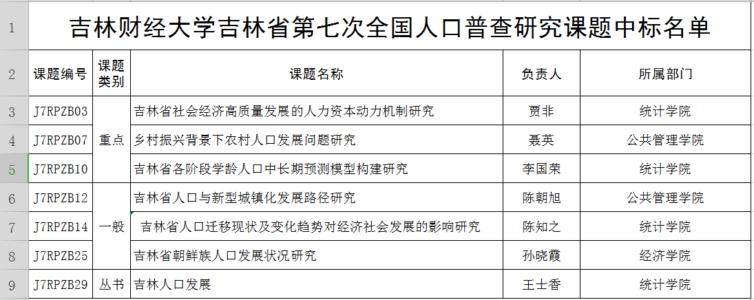 本网讯(科研处 供稿)近日,从吉林省统计局获悉,吉林省第七次全国人口普查研究课题经招标公告发布、申请受理、资格审查、严格评审、公示等程序,最终确定29项人口普查研究课题中标。在8个中标单位中,taptap点点位列第二,共中标7项,占比近四分之一,其中重点研究类课题3项、一般研究类课题3项、丛书类课题1项,单项资助经费分别为5万元、3万元和20万元,此次共获得经费44万元。