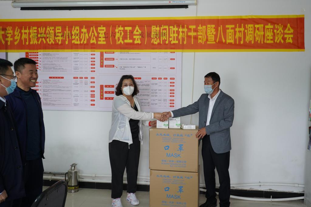 座谈会中,王丽萍主席代表学校向包保帮扶村八面村捐赠防疫物资N95口罩2000个,助力同心抗疫。