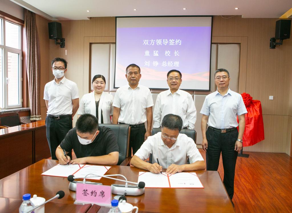 在学校领导孙杰光、刘鹤,摆渡创新工场领导刘春生、于波、王云鹏的共同见证下,童猛校长与摆渡创新工场刘铮总经理代表双方签署校企合作协议。