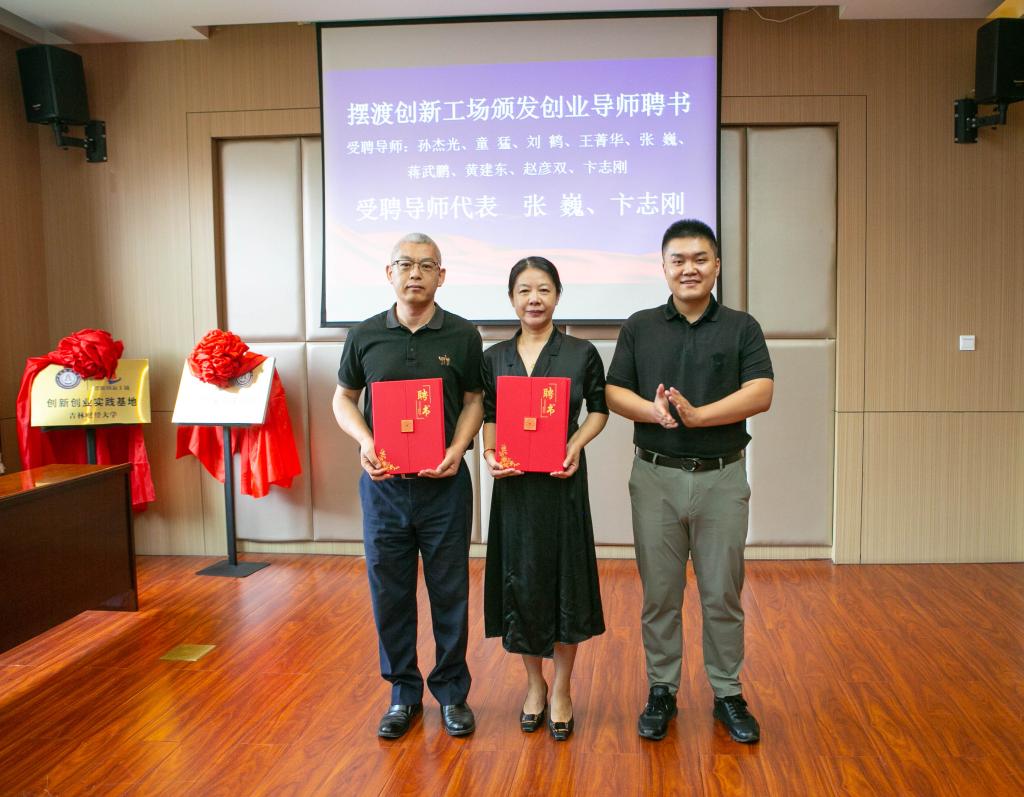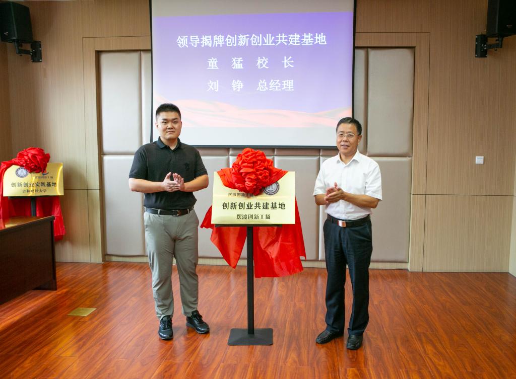 校党委书记孙杰光,摆渡创新工场董事长刘春生为“创新创业实践基地”揭牌;校长童猛、摆渡创新工场总经理刘铮为“创新创业共建基地”揭牌。