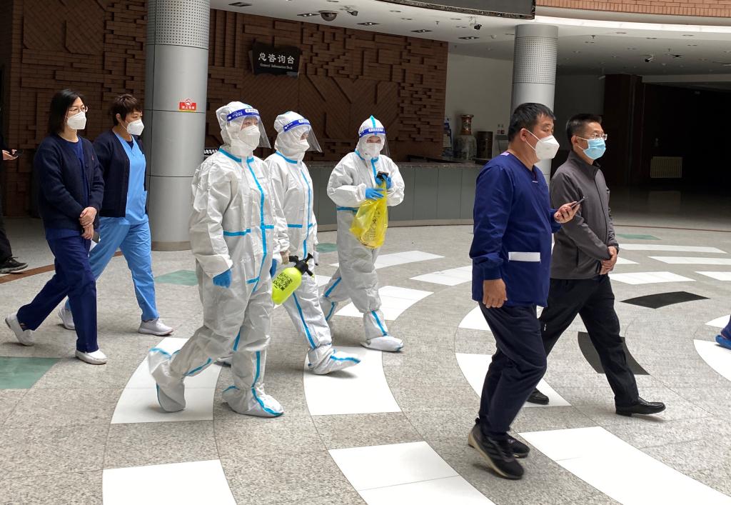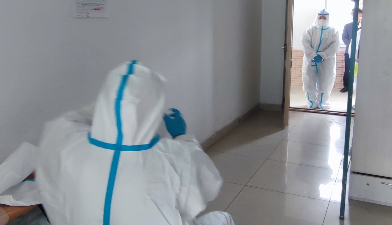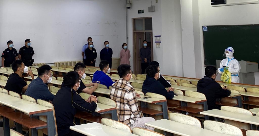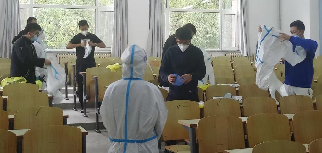 演练按计划分三个场景有序进行,“学生在寝室被发现核酸检测初筛阳性”“学生在图书馆出现发热”“学生在教室接到流调‘密接’的通知”,工作人员依流程分别进行演示和讲解。