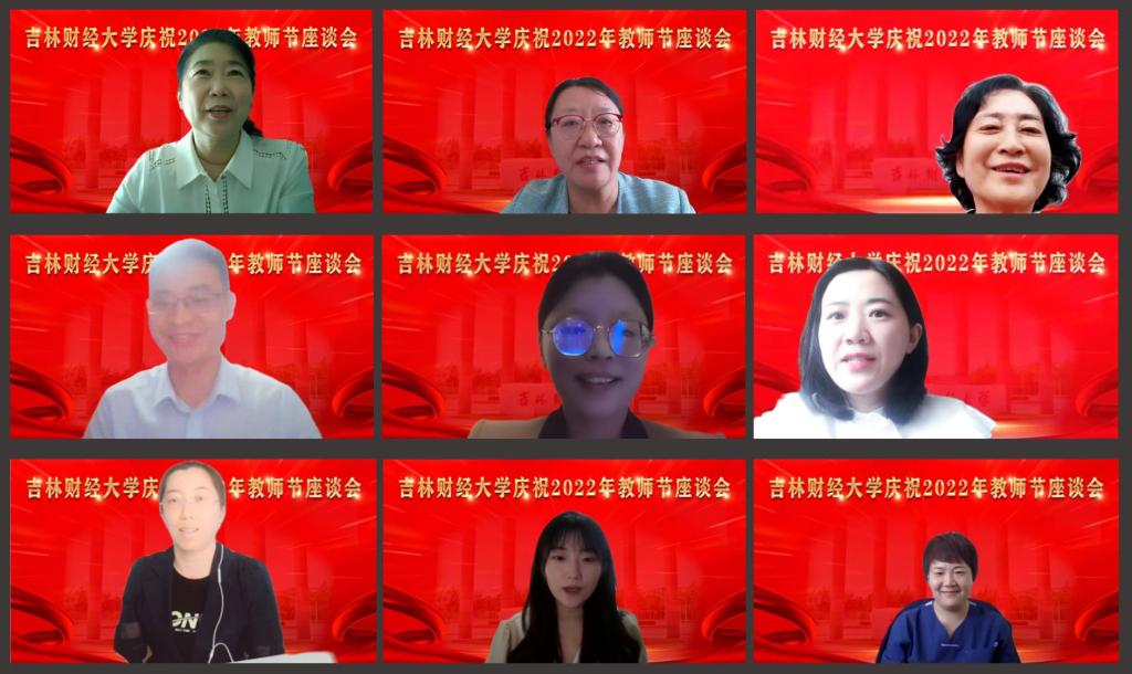 9月9日上午,学校召开庆祝第38个教师节座谈会。住校全体校领导党委书记孙杰光,党委副书记、校长童猛,党委副书记岳宏,纪委书记、监察专员丁庆东,副校长于金欢出席会议,教师代表和住校相关职能部门负责人等线上线下参加会议。会计学院刘静、金融学院刘吉舫、退休教师关晓丽、统计学院木仁、管理科学与信息工程学院贾微微、马克思主义学院张立畅、亚泰工商管理学院刘禹君、税务学院丁昭元以及校医院马妮娜等9位教职工进行了分享发言。