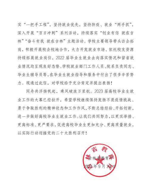 省教育厅发来的表扬信,既是对学校就业工作的高度肯定,也是对学校新一年做好就业工作的激励。学校将以此次为契机,持续把毕业生就业工作作为一项长期的重要政治任务,坚持以学生为本,不断完善就业工作体制机制,不断提升就业指导服务质量,千方百计促进2023届毕业生更加充分、更高质量就业,以实际行动迎接党的二十大胜利召开。(审核人 蒋武鹏)