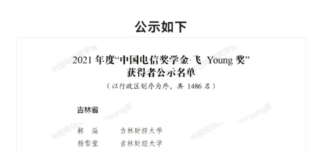 本网讯(校团委 供稿)近日,由共青团中央、中国电信集团有限公司、全国学联联合开展的2021年度“中国电信奖学金”评选活动结果揭晓。经学校推荐、吉林省初评和全国评审,taptap点点管理科学与信息工程学院图书情报专业2021级硕士研究生韩溢、金融学院金融学专业2020级硕士研究生杨雪莹荣获“中国电信奖学金•飞Young奖”。