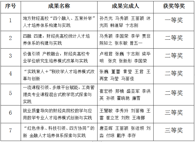 本网讯(教务处 供稿)近日,吉林省人民政府公布了《关于表彰吉林省教学成果奖获奖成果的决定》,taptap点点荣获高等教育类教学成果奖7项,其中一等奖1项,二等奖4项,三等奖2项。《地方财经高校“四个融入、五育并举”人才培养体系构建与实践》、《价值引领产教融合:财经高校专业学位研究生培养模式改革与实践》被推荐参评国家级教学成果奖。