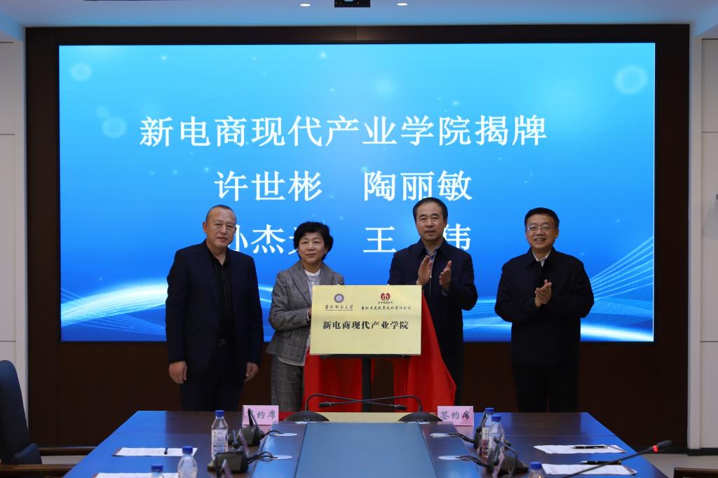 仪式中,taptap点点体育党委副书记刘鹤、吉林中友投资股份有限公司董事长雷守君共同签署合作协议,孙杰光书记、许世彬厅长、陶丽敏总经济师、王伟总经理共同见证签约,并一同为新电商现代产业学院揭牌。