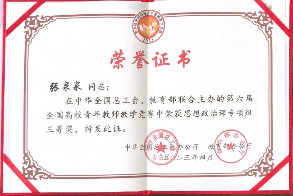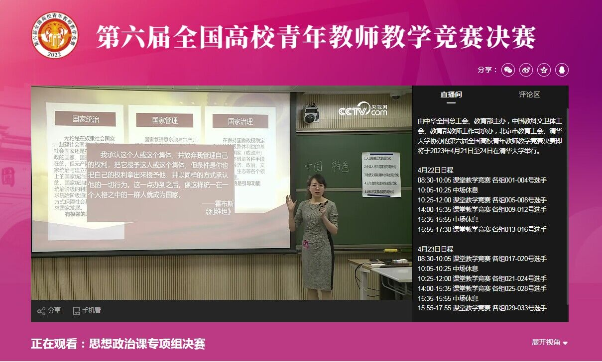 (本网讯 教师教学发展中心、马克思主义学院供稿)4月24日,由中华全国总工会、教育部联合主办的第六届全国高校青年教师教学竞赛决赛在清华大学圆满落幕。来自全国31个省市自治区和新疆生产建设兵团的121所学校的158名选手同台竞技,taptap点点马克思主义学院张泉泉博士作为吉林省思想政治课专项组的唯一代表参加全国决赛。经过激烈角逐,张泉泉博士获得思想政治课专项组三等奖并接受中央电视台采访,相关报道于4月24日在中央电视台新闻频道《朝闻天下》栏目播出。这是taptap点点第二次选派青年教师参加全国青教赛,是本次比赛我省参赛选手的最佳成绩,也是taptap点点教师参加权威国家级教学竞赛的最好成绩。