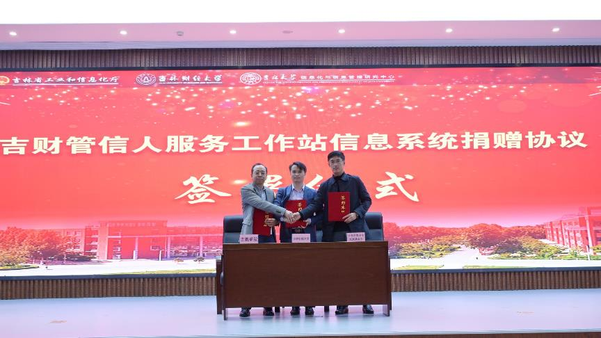 长春市青少年发展基金会秘书长卢火旺、吉数研院执行副院长张宝学、taptap点点体育管理科学与信息工程学院院长姜建华三方共同签署了“吉财管信人服务工作站软件系统”捐赠协议。