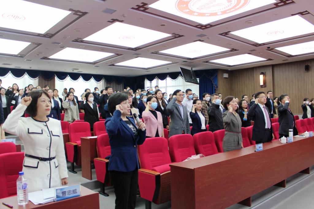 入职宣誓环节,由吉林省教学新秀荣誉称号获得者、第三届吉林省本科高校教师教学创新大赛一等奖获得者、国际经济贸易学院院长关嘉麟教授领誓。与会领导和全体新教师面向国旗,庄严宣誓。