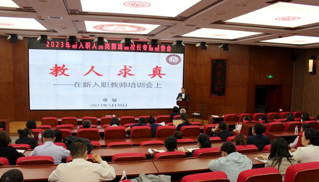 18日下午,党委副书记、校长童猛作题为《教人求真》的专题报告。会前,童猛查阅并详细了解全体新入职人员的教育背景和工作情况。报告主要分为意义、校情、期许三个部分。他强调做好新入职教师培训的重要意义,要求各位老师以高度的思想自觉参学,上好自己的入职第一课。介绍了学校的基本情况和未来发展面临的主要任务,并指出要实现学校的发展目标,需要每一个老师以好老师的标准要求自己,上好每一堂课,关心帮助每一个学生的成长成才。每一个老师都应该按照教育家的标准来完善自我、修炼品德、提高学识、增强能力和提升境界。他还向大家推荐书单,鼓励新进教师更应该多读书,读好书。最后,他提出期许,希望大家以德立身、以德立学、以德施教,做“四有”好老师。会后,童猛和新入职人员进行了亲切交谈。