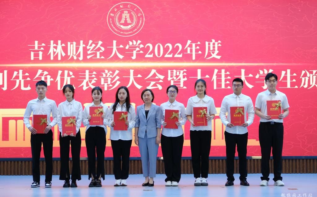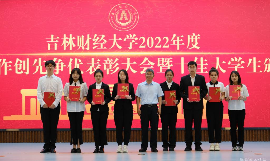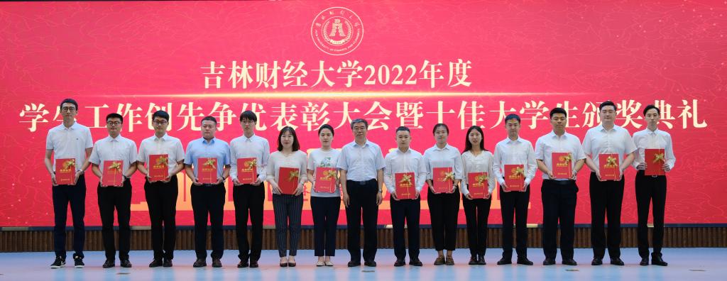 在随后进行的十佳大学生颁奖典礼仪式上,新闻与传播学院杨淞喆、外国语学院李之恒、税务学院邱健文、国际经济贸易学院陈淑婷、金融学院谷佳忆、管理科学与信息工程学院丁方一、金融学院赵恩泽、会计学院王雅岚、国际交流学院张怡诺、统计学院王馨悦十名荣获2022年度十佳大学生荣誉称号的同学受到了表彰。视频展播了十佳大学生的成长故事,十佳大学生的辅导员为他们宣读了颁奖词,各学院党委(党总支)书记、院长为本学院十佳大学生颁发了奖牌和荣誉证书,获奖学生分别发表了感言,表达了自己获得这一殊荣的欣喜和对学校培养的感激之情。