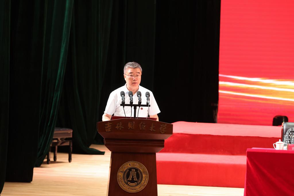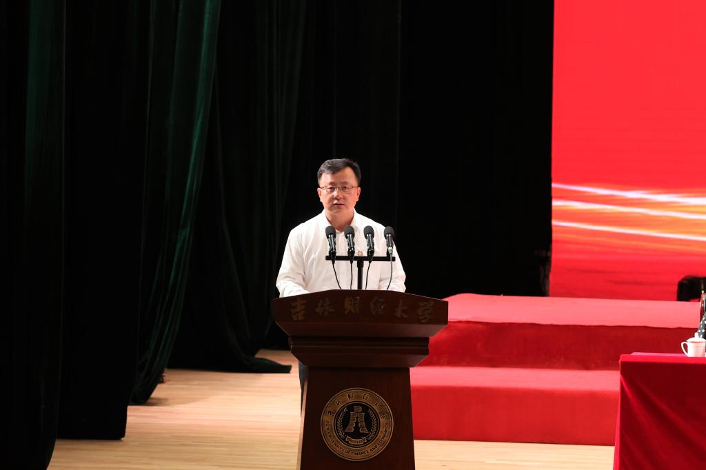 会计87级校友代表、长春校友会会长、中兴华会计师事务所所长安洪滨在会上作了讲话。他表示,2023届毕业生们生逢其时、重任在肩,虽前路漫漫,还会经风雨。作为学长,他对毕业生们寄予三点希望:第一,希望他们胸有天下,勇担责任;第二,希望他们心中有梦,眼中有光。第三,希望他们脚下有力,逐梦前行。安洪滨表示,学校的发展离不开校友的赤诚情怀和聪明才智,希望同学们在各自岗位上不断进取、开拓创新,用不同的方式共同擘画吉财新蓝图。