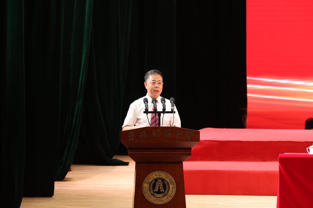 最后,校党委副书记、校长童猛作了热情洋溢的致辞。他首先代表学校向即将毕业的2032届学生表示最热诚的祝福,向辛勤培育毕业生的父母、老师表达最崇高的敬意和最美好的祝福。童猛指出,2023届的毕业生风采卓然、其气自华,集中体现了全体学子在吉财取得的成长和进步;四年来,大家与学校共同经历了振奋人心的时刻:一同见证伟大祖国如期打赢脱贫攻坚战,如期全面建成小康社会、实现第一个百年奋斗目标,共同经历庆祝中华人民共和国成立70周年、建党一百周年、建团一百周年,共同见证党的二十大的胜利召开;大家与学校也共同经历了艰难困苦的时刻:三年疫情,风风雨雨,坎坎坷坷,但终究,在风雨之后见到了彩虹;大家与学校更是共同经历了平凡中的不平凡。童猛有感于陶行知先生“千教万教教人求真,千学万学学做真人”的教诲,赠2023届毕业生们一个字——“真”:“真”是真知、是认真、是真诚、是纯真。他希望同学们牢记习近平总书记的殷殷嘱托,心向远方、脚踏实地,为国家为社会作出无愧于时代的贡献,实现自己人生的价值。