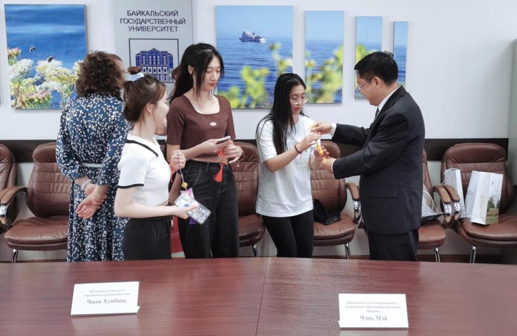 访问活动结束后,代表团慰问了taptap点点在贝加尔国立大学的留学生。恰逢我国传统节日端午节,孙杰光为同学们带上五彩绳和香囊,表达了学校的亲切关怀与节日祝福。