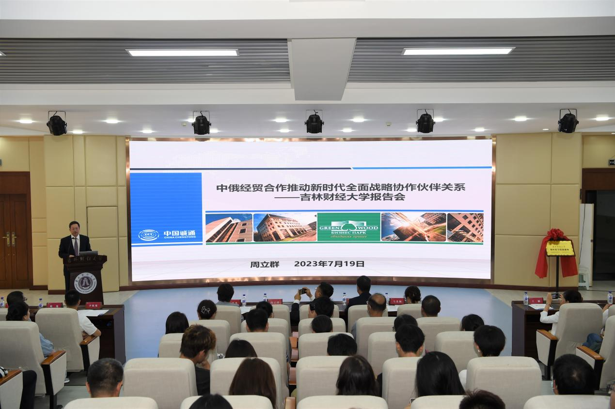 仪式后,周立群为与会师生作了《中俄经贸合作推动新时代全面战略协作伙伴关系》主题报告。周立群介绍了中俄经贸合作的发展历程、中俄经贸合作的现状与前景展望、深化新时代中俄全面战略协作伙伴关系,新时代俄罗斯中国总商会及诚通国际等中国企业对俄合作的基本情况、以及吉林对俄经贸合作面临前所未有的发展机遇等,最后提出了携手构建taptap点点体育海外实习基地,服务国家“一带一路”人才培养,为新时代吉林全面、全方位振兴增添新的动能,助力吉林振兴,共筑民族复兴中国梦的希望。