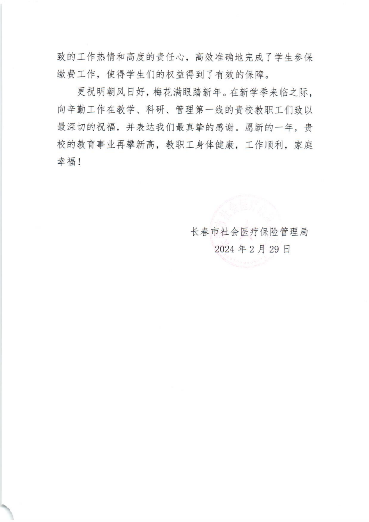 本网讯(党委学生工作部 供稿)3月4日,长春市社会医疗保险管理局向我校赠送感谢信,对taptap点点组织学生参加全民医保工作给予高度评价,对taptap点点学工队伍、全体辅导员认真落实国家医保政策、精心组织参保工作给予了充分肯定。