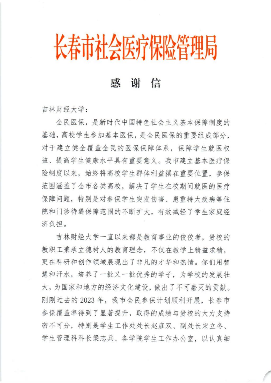 大学生基本医疗保险是一项惠及民生的工作,关系到学生的切身利益,做好在校大学生医保工作,是实现扩大社会保险覆盖面、实现全民医保的一项重大举措。未来,学校将坚持把“好事办好,实事办实”,进一步加强政策宣传,简化医保工作流程,提高服务工作水平,将国家医保政策落实到位,为同学们的健康保障提供有力支持,为社会医疗保障体系建设做出吉财贡献。(审核人 赵彦双)