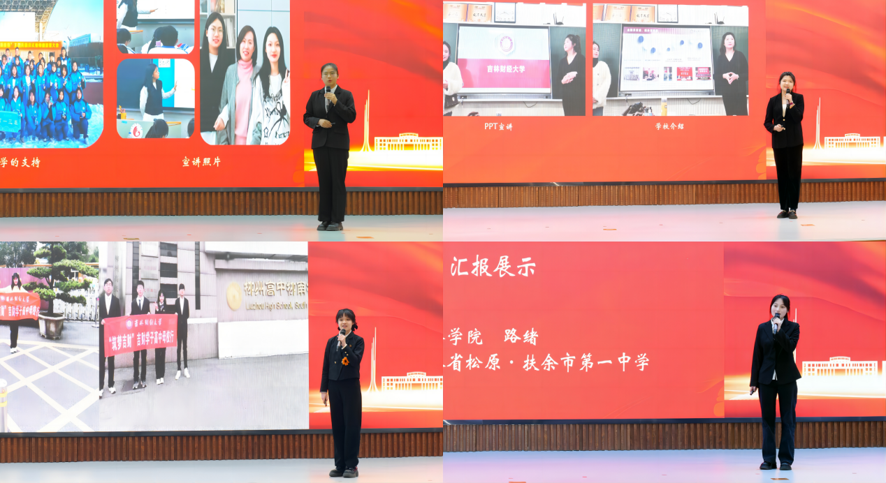 表彰典礼上,国际交流学院王子琪、亚泰工商管理学院梁靖麟、法学院王鸣晨、经济学院路续作为志愿者代表分享参加活动的经验和感受。