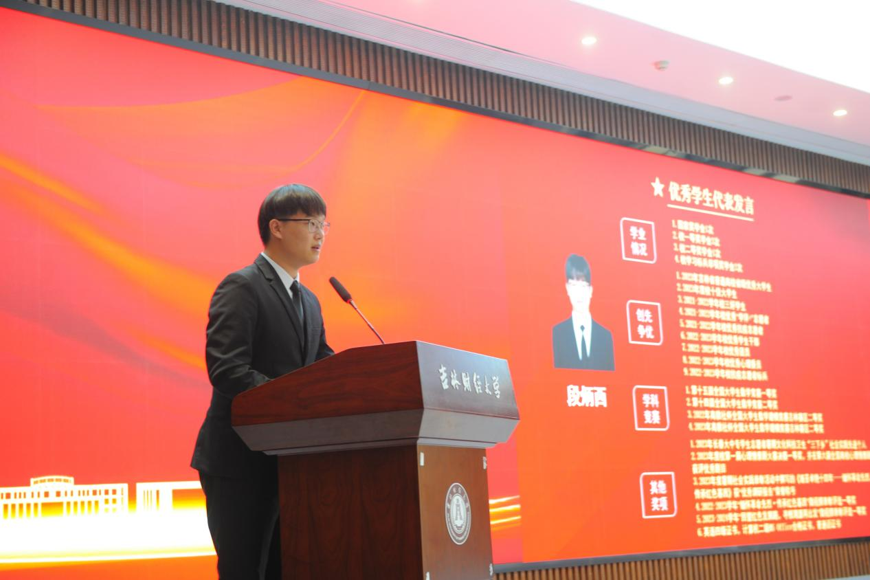 会计学院大三学生叶雨薇、应用数学学院大三学生段炳西作为taptap点点体育2023年度十佳大学生代表上台发言,鼓励吉财学子们要坚定理想信念、拥有家国情怀,常怀感恩之心,锤炼品德修为,传承母校的荣誉,更要继承发扬母校的责任。
