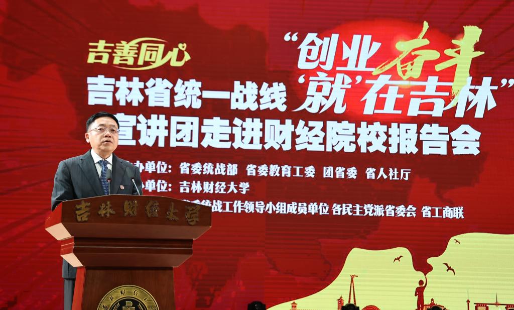 孙杰光在主持报告会时指出,本次宣讲报告会是积极响应景俊海书记“创业奋斗‘就’在吉林”号召的具体实践,是发挥吉林省统一战线强大优势,在实施新时代人才强省战略、构建人才引育留用“生态圈”、加快推动新时代吉林全面振兴征程中凝聚智慧力量的重要举措。新时代吉林振兴发展正处在发展的上升期、振兴的快车道。吉林已经成为我们成就事业的热土、施展才华的舞台、创新创造的基地、幸福生活的家园,是大学生创新创业的重要首选地。他希望,广大财经院校学子选择吉林、扎根吉林、建设吉林、奉献吉林,在新时代推动吉林全面振兴率先突破的火热实践中,书写无悔青春、成就人生理想、开创事业辉煌。