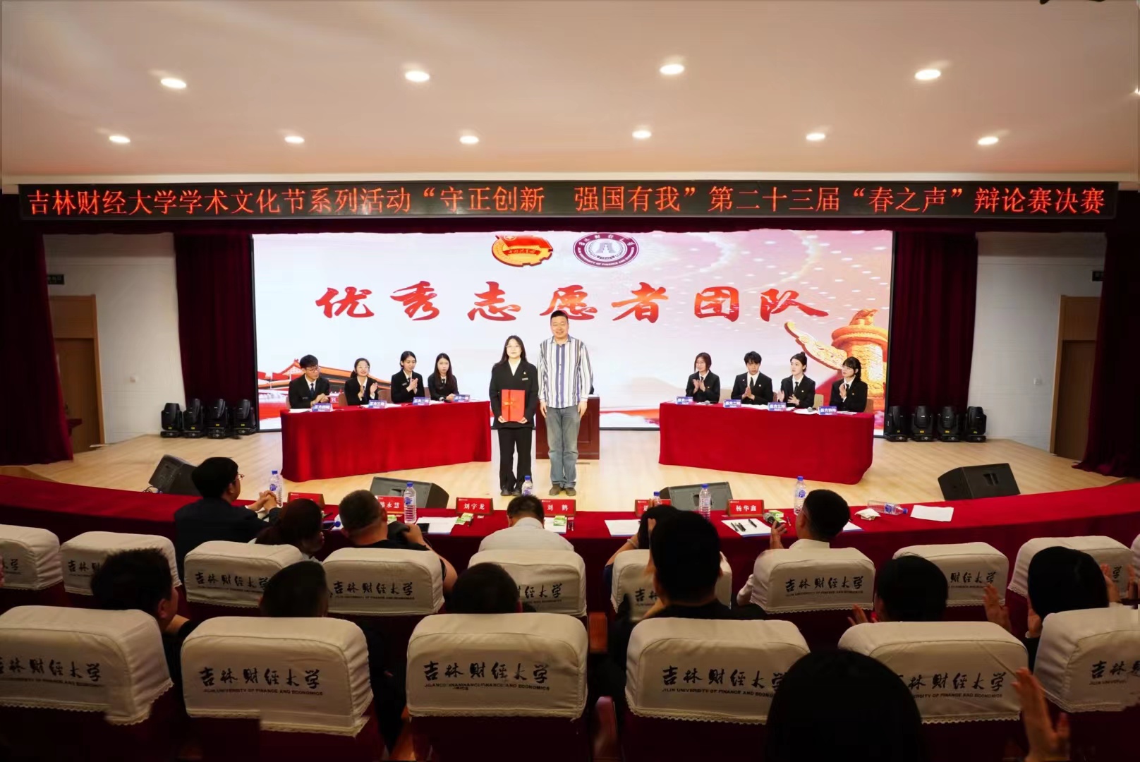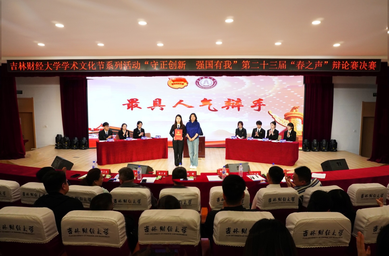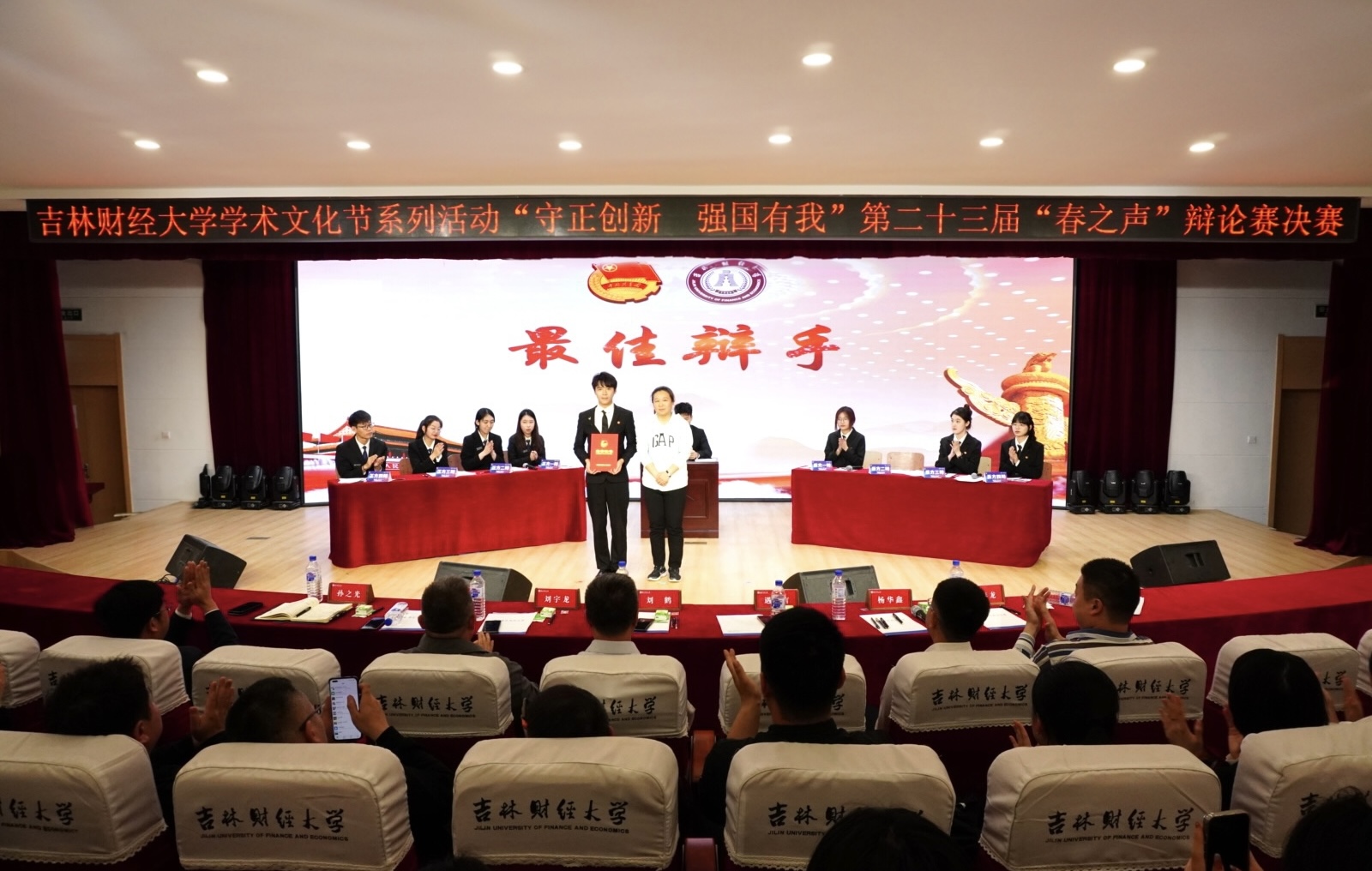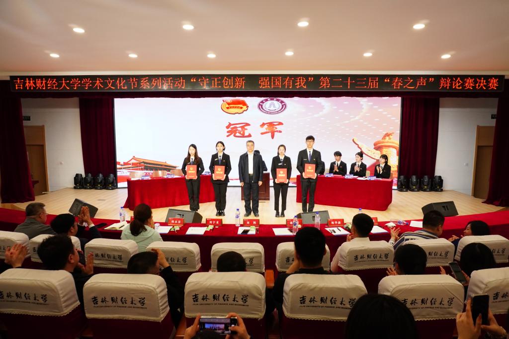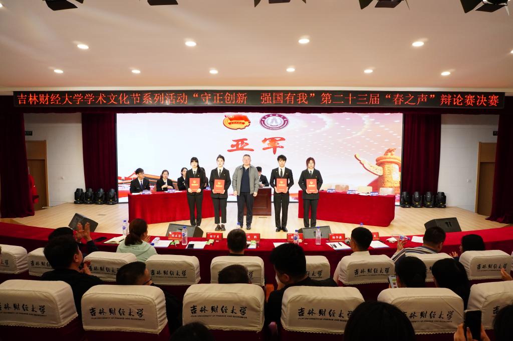 本届“春之声”辩论赛以“守正创新 强国有我”为主题,围绕国情社情、创新创业、吉林高质量发展、青年成长成才等内容。自4月3日初赛以来,历时1个月,14个学院进行了12场比赛。最终金融学院辩论队与国际经济贸易学院辩论队晋级决赛。决赛辩题围绕“新时代东北全面振兴,重在提升硬实力还是发展软环境”,双方展开激烈交锋。辩手比赛中高强度的语言对抗,将比赛一次次推向高潮,为在场的观众带来一场精彩的听觉盛宴。最终国际经济贸易学院荣获冠军,金融学院荣获亚军。金融学院王建业、国际经济贸易学院刘至立分获“最佳辩手奖”和“最具人气辩手奖”,学生会学习部荣获“优秀志愿者团队奖”。净月高新区团区委副书记、taptap点点05级校友杨华鑫对比赛进行了点评,并对选手比赛中的立论方式和辩论技巧提出了良好的意见和建议。(审核人 孙之光)