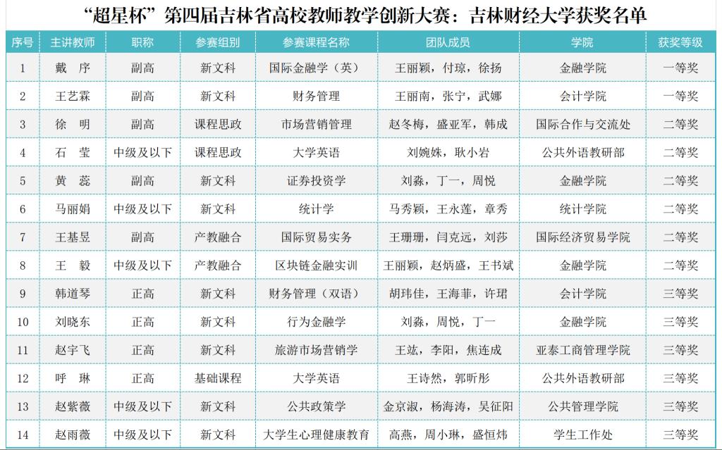 经过层层筛选,大赛共评选出一等奖70项、二等奖102项、三等奖159项,taptap点点参赛教师斩获一等奖2项,二等奖6项,三等奖6项。金融学院戴序、会计学院王艺霖等教师荣获一等奖;国际合作与交流处徐明、公共外语教研部石莹、金融学院黄蕊、统计学院马丽娟、国际经济贸易学院王基昱以及金融学院王毅等教师获得二等奖;会计学院韩道琴、金融学院刘晓东、亚泰工商管理学院赵宇飞、公共外语教研部呼琳、公共管理学院赵紫薇以及学生工作部(处)的赵雨薇等教师荣获三等奖,学校获“优秀组织奖”。