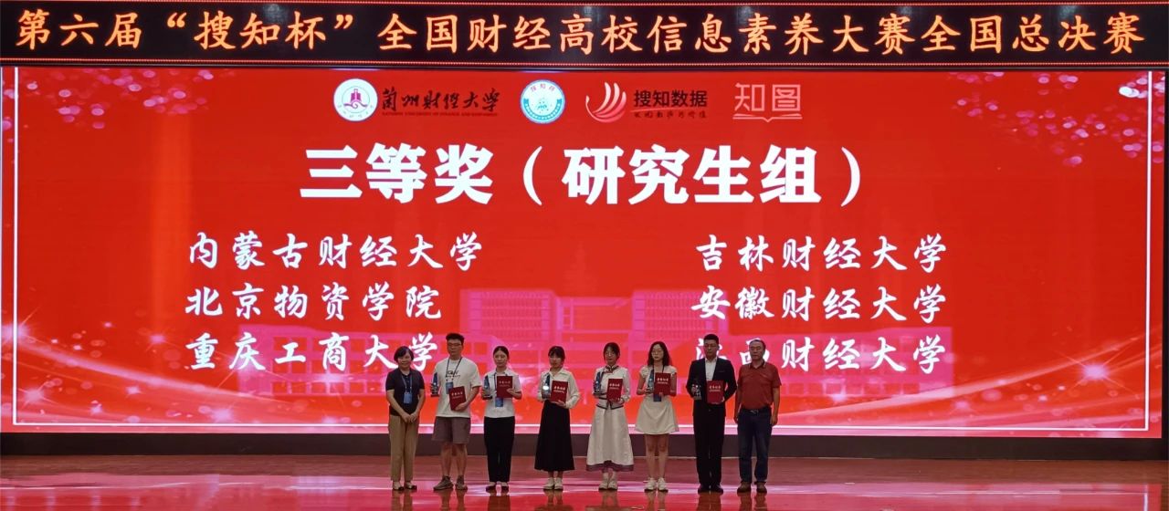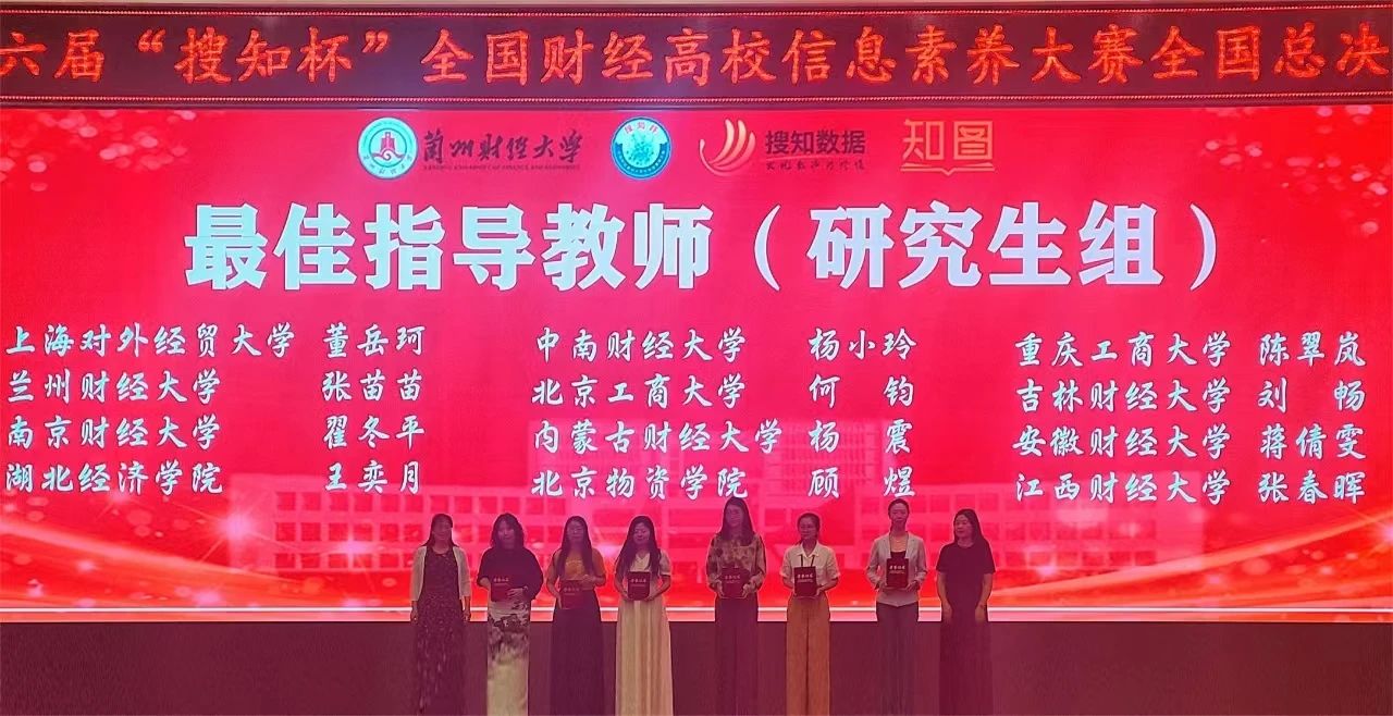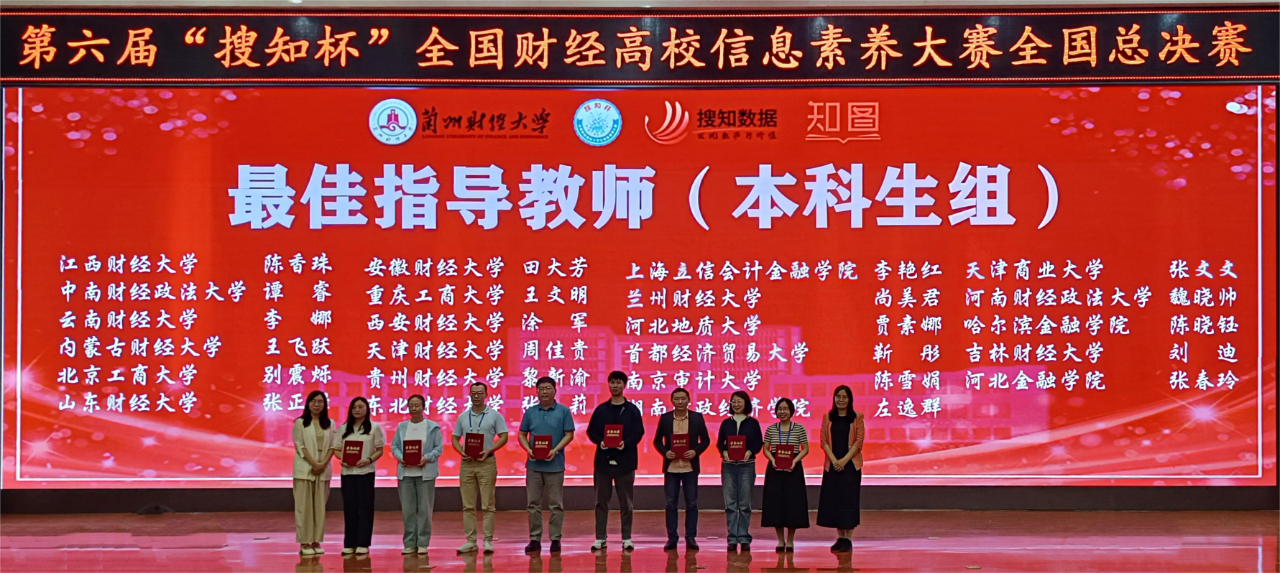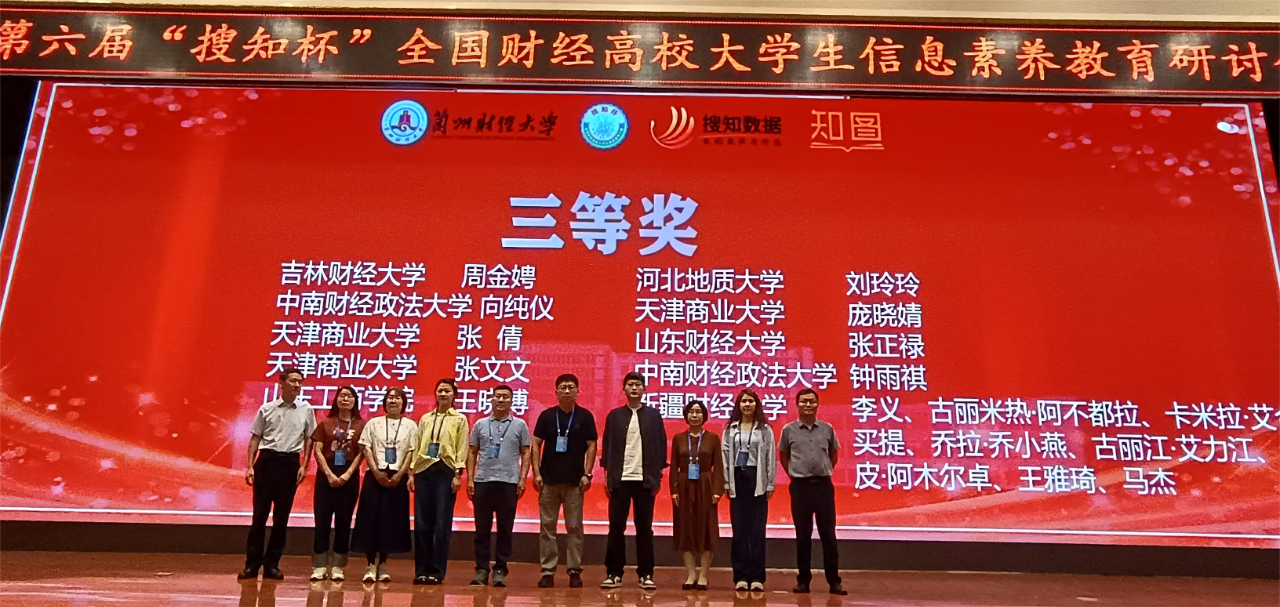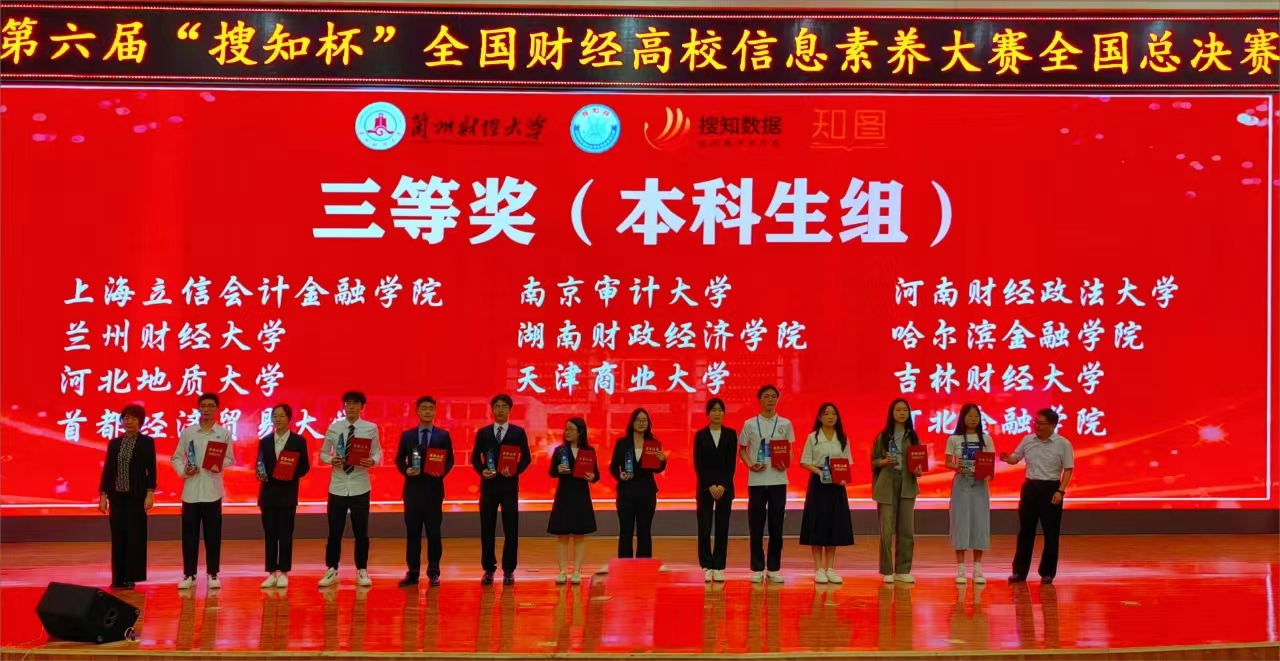 本网讯(图书馆 供稿)5月25日至26日,第六届“搜知杯”全国财经高校大学生信息素养大赛全国总决赛在兰州财经大学举办,taptap点点由国际经济贸易学院卢亮、会计学院莫钧豪、国际交流学院胡雨轩组成的本科生队,管理科学与信息工程学院苗航语、雷玉勋、刘东昕组成的研究生队,分别荣获本科生组三等奖、研究生组三等奖,刘迪、刘畅荣获最佳指导教师奖,学校图书馆荣获组织奖;在教师组微课大赛中,管理科学与信息工程学院周金聘荣获三等奖。