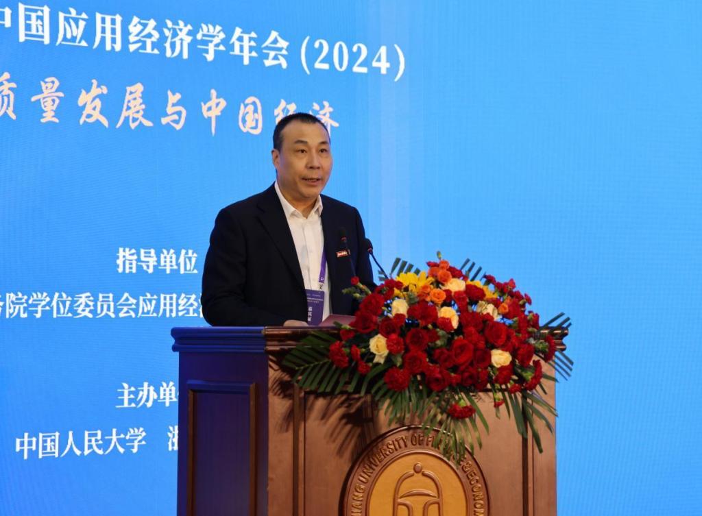 郑新业代表主办方中国人民大学对年会的召开表示祝贺。他表示本次大会以“高质量发展与中国经济”为主题,邀请应用经济学学科带头人交流研讨,协同创新、共谋发展,唱响中国经济光明论正当其时,意义重大。高校作为教育、科技、人才的集中交汇点,应在发展新质生产力中展现更大作为。他希望学界同仁立足中国国情,以服务中国式现代化为出发点,努力构建中国自主的应用经济学知识体系,推进新质生产力体系化和学理化研究,自觉以回答中国应用经济学的中国之问、世界之问、人民之问、时代之问为学术己任,为推进高质量发展、强国建设、民族复兴提供理论支撑和智力支持。