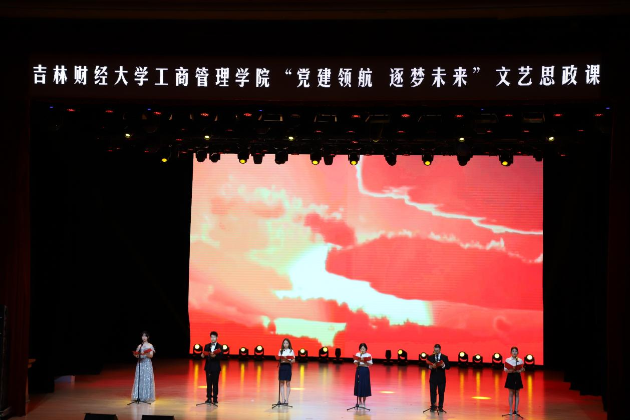 军乐团《走向复兴》的铿锵旋律拉开了文艺思政课第一篇章的序幕。舞蹈《天下吉商》恢弘大气,彰显了吉商精神的代代传承,也向同学们发出了“留吉就业、建设吉林”的青春号召;师生诗朗诵《中国梦 中国红》在时光隧道中追忆先烈、致敬历史、憧憬未来,以吉财人特有的方式送上了对党的生日的殷殷祝福;歌曲《让我们一起远航》唱出了青春的朝气和跃动,更唱出了青年人的理想和坚定。