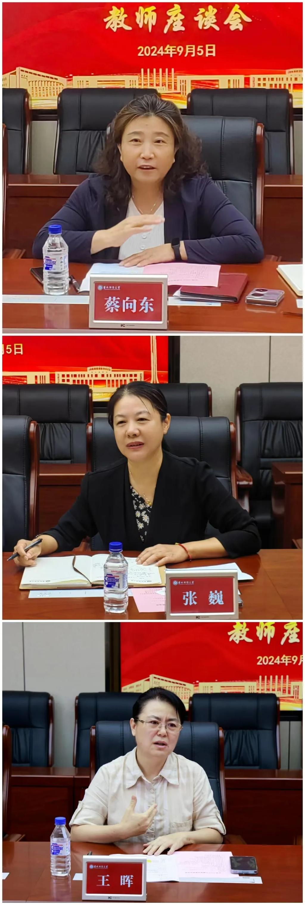 座谈会上,公共管理学院蔡向东教授,税务学院张巍教授,马克思主义学院王晖教授,教师教学发展中心副主任孙亚南副教授,统计学院青年教师王际皓,国际交流学院青年教师王雅蓉,工商管理学院党委副书记遇言,图书馆馆长朱雪刚,校医院副院长马妮娜等9位教师代表,围绕自己的入校入职经历、教师职业规划、教育教学改革以及感恩学校培养等主题踊跃发言,充分肯定了学校近年来改革发展取得的成绩,就学科建设、教学科研、个人成长和教师队伍培养培训等方面提出了许多宝贵建议。