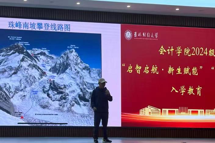 张清亮校友从自己求学、工作、徒步走完川藏线,到成功攀登珠峰的亲身经历详细为新生们做了分享,语重心长地向新生们提出了宝贵的建议与忠告。从成功攀登珠峰的艰辛过程中,讲述重启人生的过程。不惧年龄、做自己喜欢的事情,树立高远的人生目标,并为此不懈努力,从开始遥不可及的艰难,到目标达成,他认为绝大部分困难都是出发之前想象出来的,而一路走下来,困难竟然在一步一步的行进中逐渐消失了。