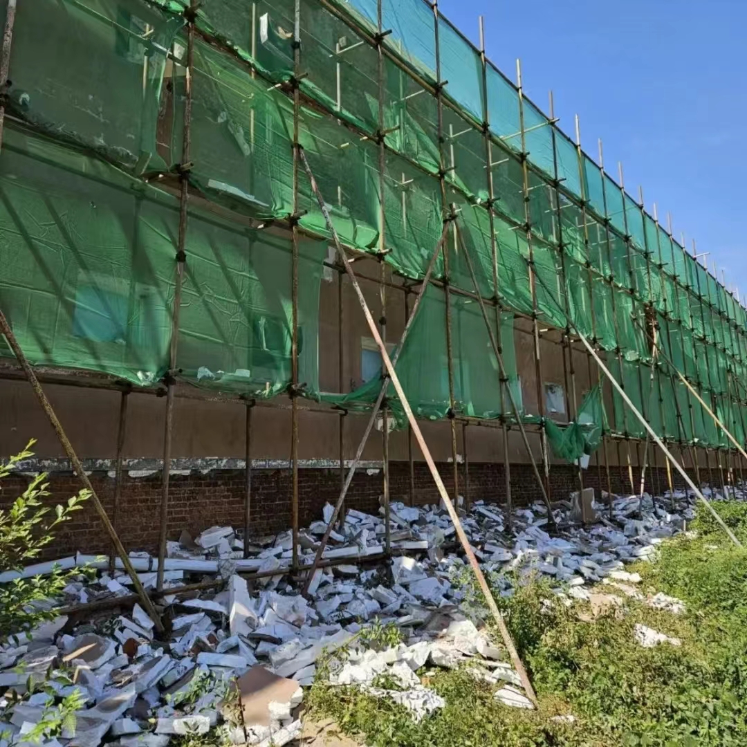 大刀阔斧施工中,对图书馆涂料面、部分破损外墙砖铲除,立面抹灰层清除、墙面基层处理、墙面抹灰、涂抹保温岩泥、真石漆仿砖涂料刮涂等。