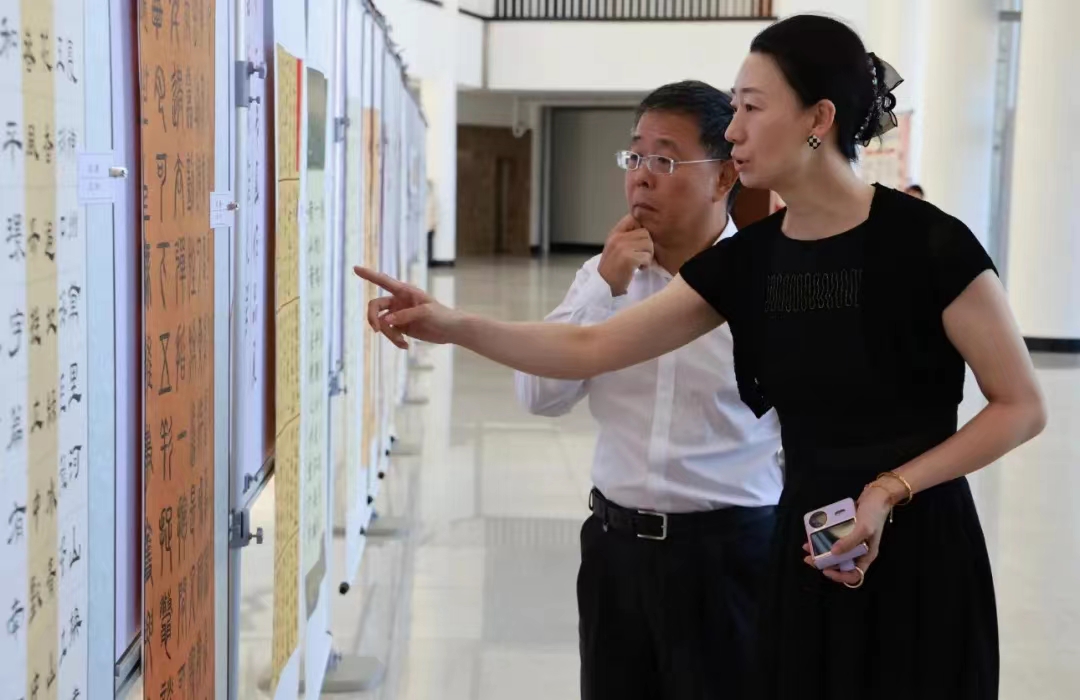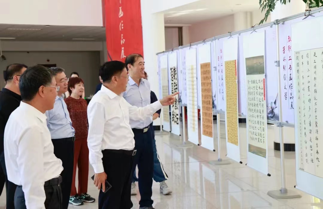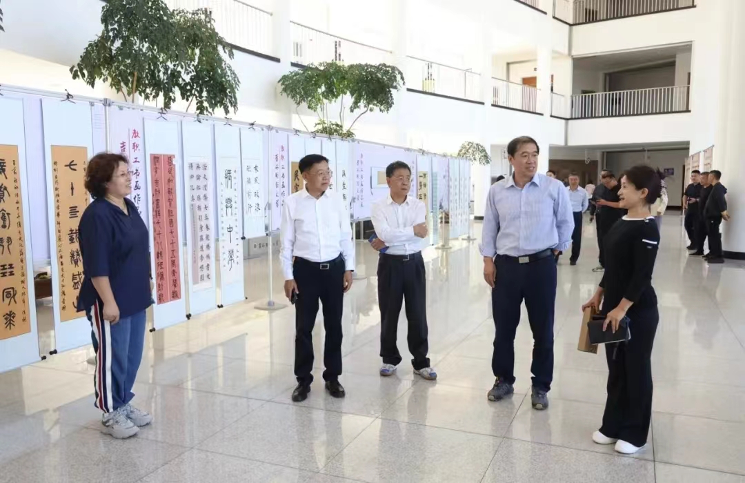 书画作品展览于9月10日中午在综合楼一楼大厅正式开幕,学校领导孙杰光、童猛、岳宏、刘鹤、丁庆东、王菁华、祝国平以及党群部门负责人等参加了此次展览活动。