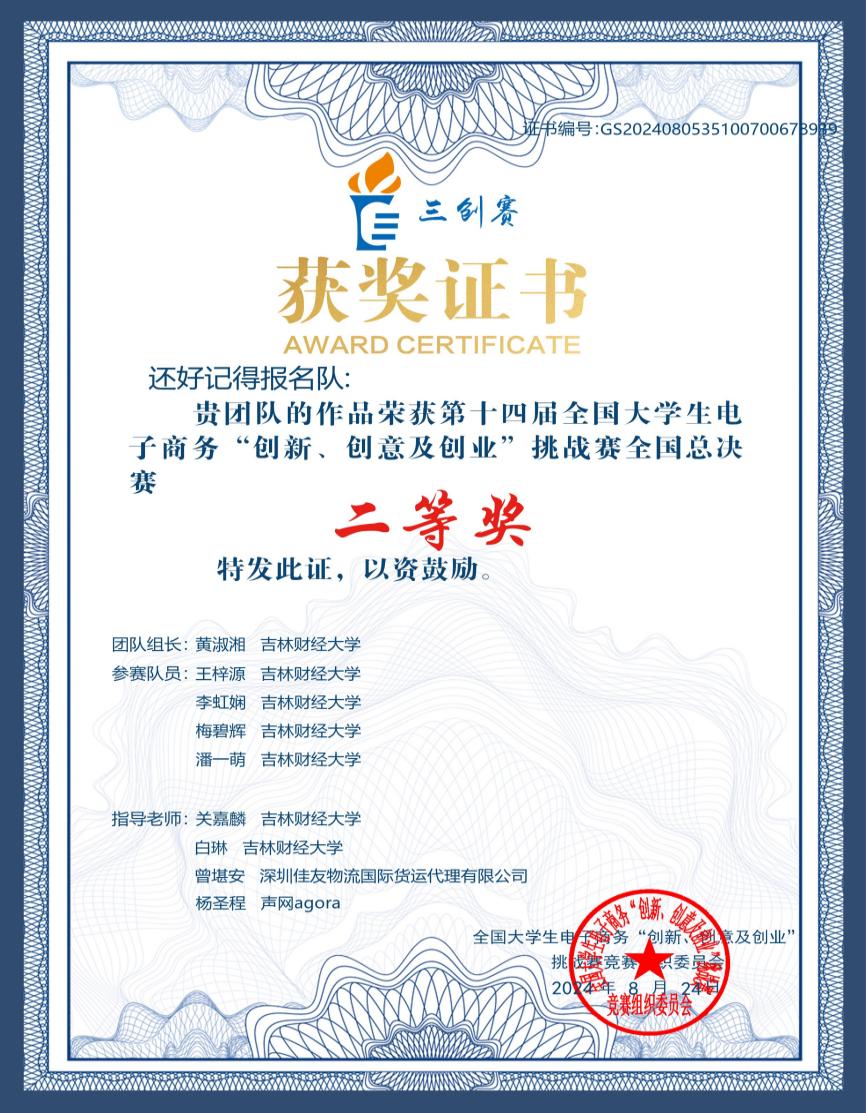 在常规赛全国总决赛中,由taptap点点国际经济贸易学院关嘉麟教授、白琳老师指导,经济学院黄淑湘和、潘一萌,国际经济贸易学院李虹娴、国际交流学院梅碧辉、会计学院王梓源组成的团队,凭借《百可e 商通——跨境贸易智慧枢纽和梦想的引擎驱动者》项目荣获实战赛全国总决赛二等奖。项目立足长吉图战略,致力于东北振兴和东北亚合作,促进跨境电商人才成长、产业转型和经济增长。