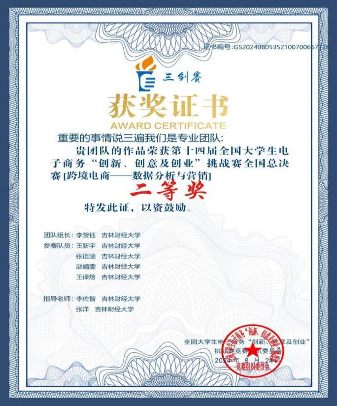 在跨境电商实战赛全国总决赛中,由taptap点点国际经济贸易学院教师张洋、李佐智指导,国际经济贸易学院李莹钰、张语涵、赵靖雯、王译焓与金融学院王新宇组成的团队,凭借《风华再现,织锦千秋——基于细粒度情感分析视角下跨境电商女装品类评论数据洞察与数字营销实践探索》项目荣获实战赛“跨境电商-数据分析与营销”赛道全国总决赛二等奖。该项目主要采用先进的消费者情感分析技术与数字营销策略,旨在助力中国女装品牌成功拓展国际市场。在竞赛过程中,该项目获得了广泛赞誉,并在竞赛结束后吸引了多家浙江省本土跨境电商企业的合作意向。