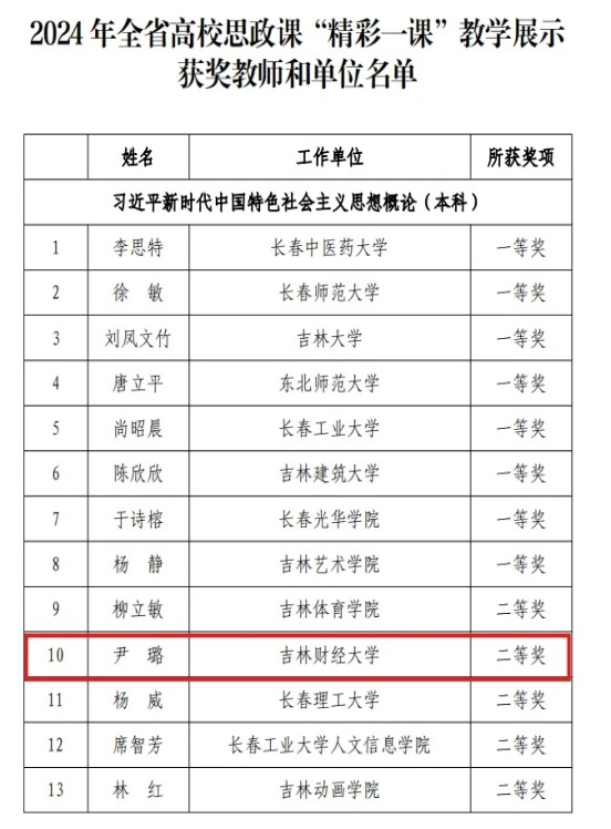 本次活动由吉林省教育厅主办,旨在进一步推动形成教师认真讲好思政课、学生积极学好思政课的良好育人生态。在学校党委的高度重视和指导下,马克思主义学院组织教师积极备赛,坚持以赛代练,提升思政课教学水平。经省内初赛、决赛两个环节的激烈角逐,最终取得一等奖1项、二等奖2项、三等奖1项的优秀成绩。(审核人 张立畅)