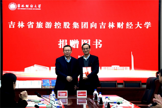 签约仪式上,孟庆凯、刘超、李昌军、赵丹辉分别向学校大学图书馆、研究生学院、工商管理学院以及学生代表捐赠了《简明吉林历史》《守望——吉林边疆人文地理纪事》图书。
