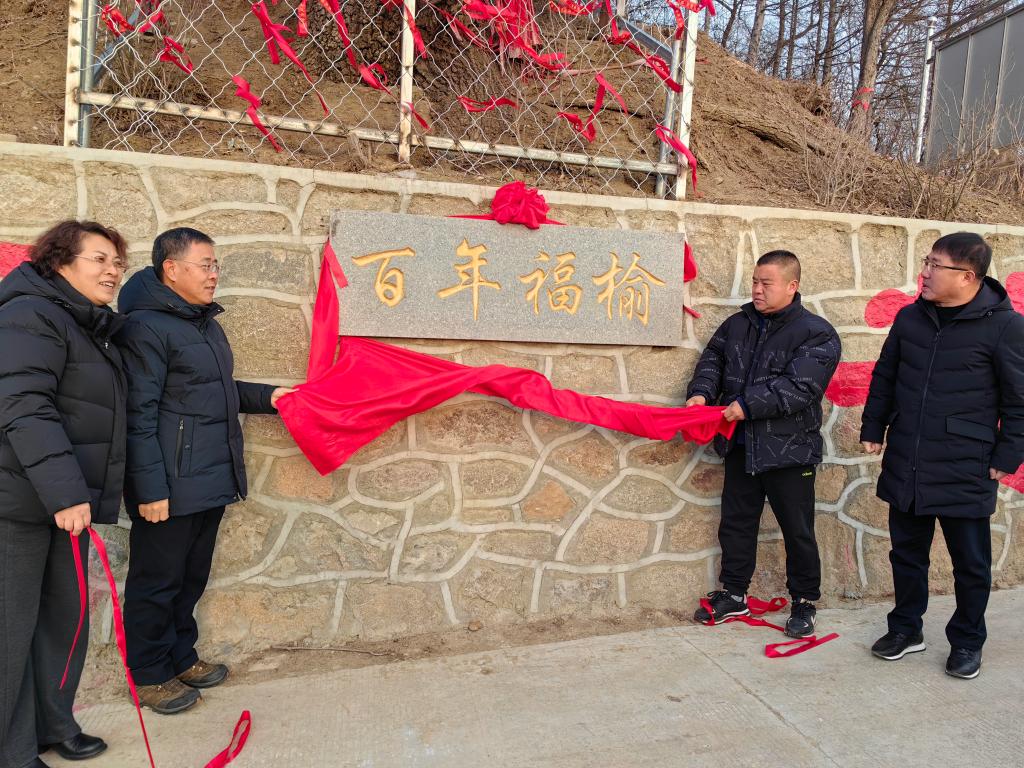 在迎花村,校领导一行到学校帮扶项目“百年福榆”旅游景点调研了项目建设情况,并举行了“百年福榆”揭牌仪式,童猛、工会主席王丽萍、李镐和迎花村党支部书记金熙权共同为“百年福榆”项目揭牌。