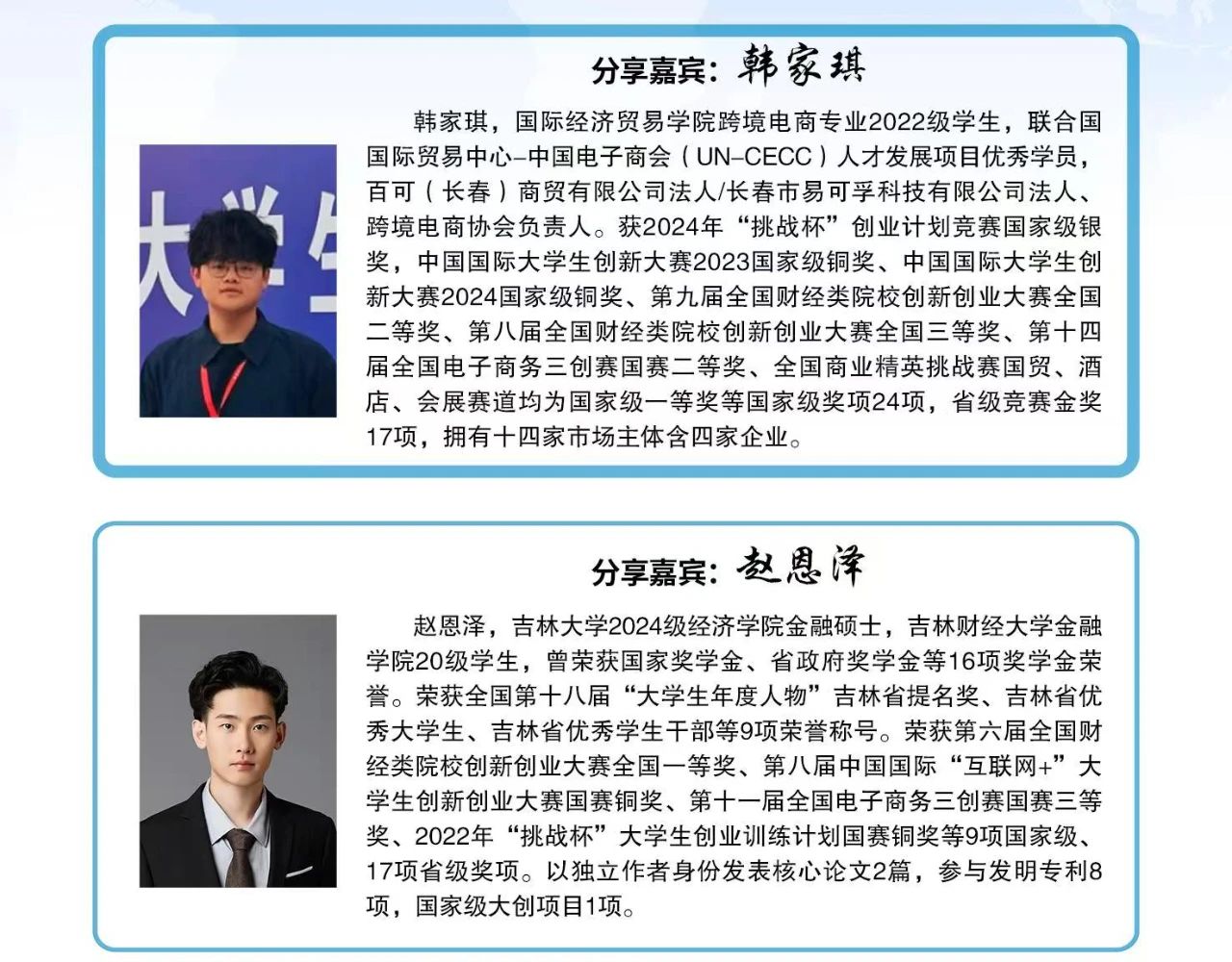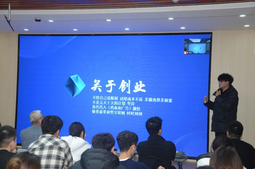 分享嘉宾赵恩泽通过自身参加创新创业类竞赛的经历激励同学们不断进取、努力拼搏。赵恩泽认为,商业计划书项目背景是基石,要把握痛点趋势;核心技术与创新点是关键;市场分析中商业模式与盈利模式很重要;财务规划要合理,团队建设要学科交叉与专家指导。
