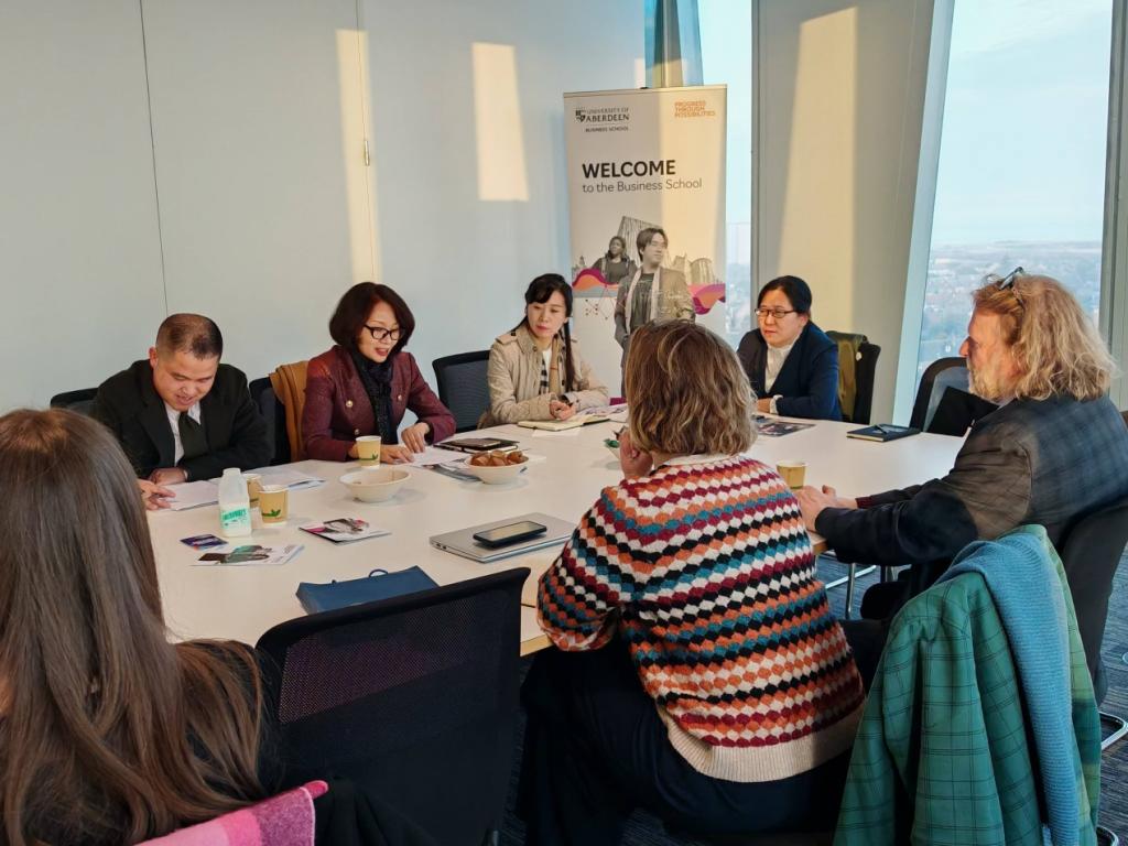 12月12日,代表团一行访问了英国阿伯丁大学。阿伯丁大学商学院院长John D. Skatun、国际事务部主任Agathe Rouaix、商学院国际合作与招生办公室主任Claire McArther接待访问团,并举行座谈会。双方互相介绍了办学历史、办学理念、课程设置、国际化办学等情况,就可能开展的合作项目进行了深入讨论。代表团随后参观了该校教学场所,并与学生进行了亲切交流。