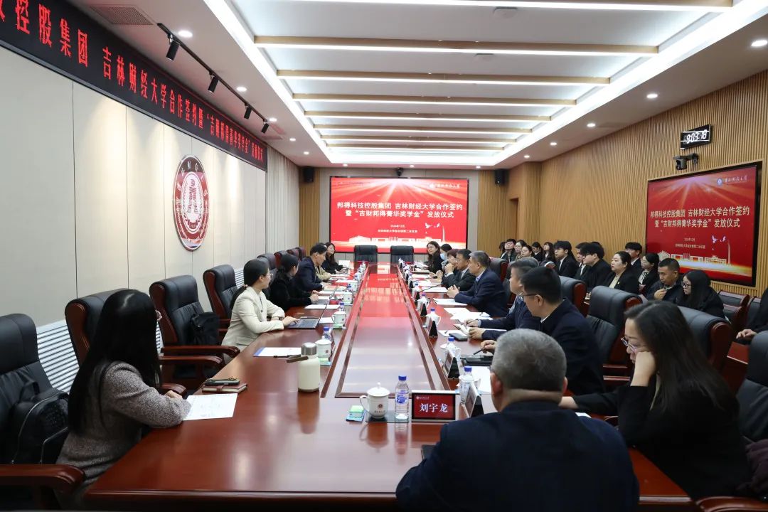 本网讯(校友工作办公室 供稿)2024年12月30日,学校与邦得科技控股集团举行校企合作签约暨“吉财邦得菁华奖学金”发放仪式。党委副书记、校长童猛,党委副书记刘鹤,副校长王菁华,邦得科技控股集团副董事长兼金融板块总经理、学校七八级校友崔少华,集团执行董事兼康养板块总经理赵建榕,集团董事长助理兼教育板块总经理孙东梅,集团先丰低碳传媒副总监孙小琼等出席仪式。仪式由刘鹤主持。