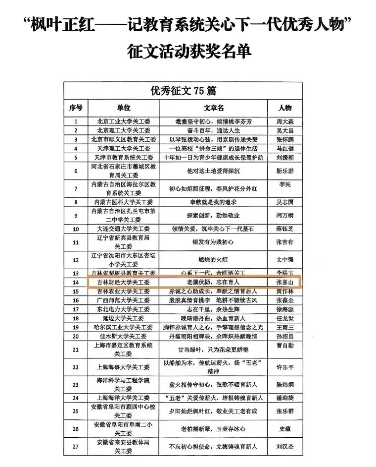 本网讯(党委宣传部 供稿)近日,在教育部关工委开展的“枫叶正红—记教育系统关心下一代优秀人物”征文活动中,taptap点点由学生记者姜晰文、王薇撰写的《老骥伏枥,志在育人—记taptap点点体育关工委主任张喜山》荣获优秀征文。